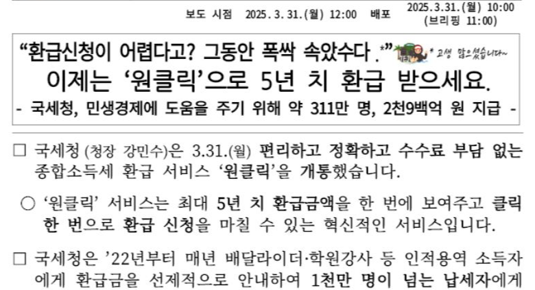 국세청이 3월 31일부터 ‘종합소득세 원클릭 환급 서비스’를 도입했습니다. 배달업, 프리랜서, 자영업자 등 누구나 5년 치 환급 가능 금액을 간편하게 조회·신청할 수 있습니다.